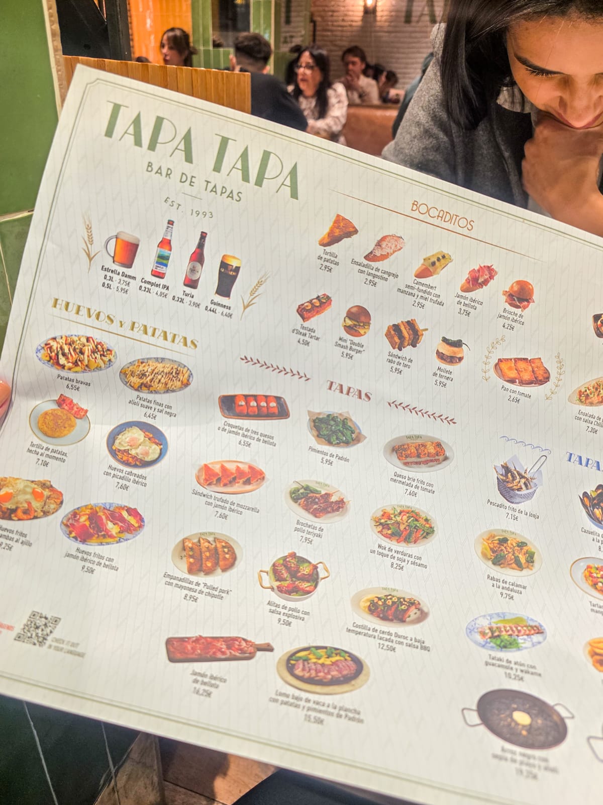 Experimentar tapas é obrigatório em qualquer viagem à Espanha, e Madri eleva essa tradição ao máximo. Para começar, inclua no seu roteiro uma visita ao Mercado de San Miguel, um dos mercados gastronômicos mais famosos da cidade. Lá, você encontra uma seleção irresistível de tapas frescas e criativas: desde azeitonas gourmet e croquetas artesanais até jamón ibérico cortado na hora, frutos do mar e taças de vinho espanhol perfeitas para acompanhar. Se quiser complementar a experiência, vá também ao Tapa Tapa, uma franquia muito querida pelos madrilenhos e presente em vários pontos da cidade. O cardápio reúne tapas clássicas como patatas bravas. O menu tem um ótimo custo-benefício.